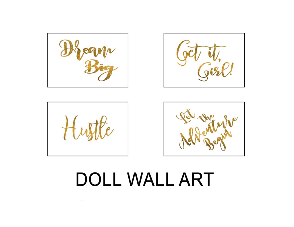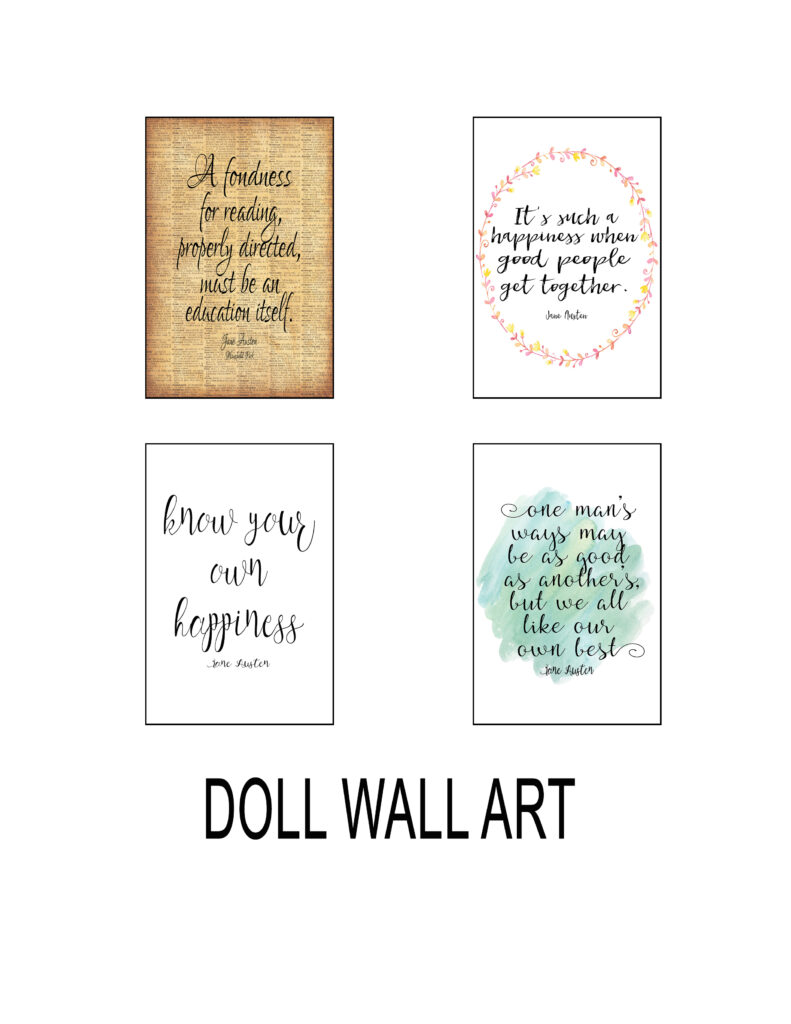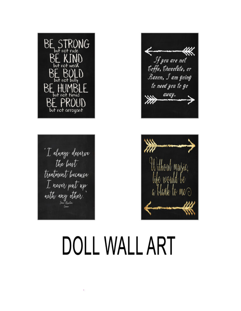 Decorate your 18 inch dollhouse with trendy printable wall art! This printable bundle of 20 art prints includes 5 collections that are sure to inspire: Dream Big, Be You, Chalkboard, Bible Verse, and Jane Austen each with 4 wall art print miniatures that will look fabulous hanging in your doll’s home! Each wall art print measures 2×3 and comes with a thick border for easy cutting out. Your American Girl Doll, My Life Doll, or Our Generation Doll need these printable art prints for their dollhouse!