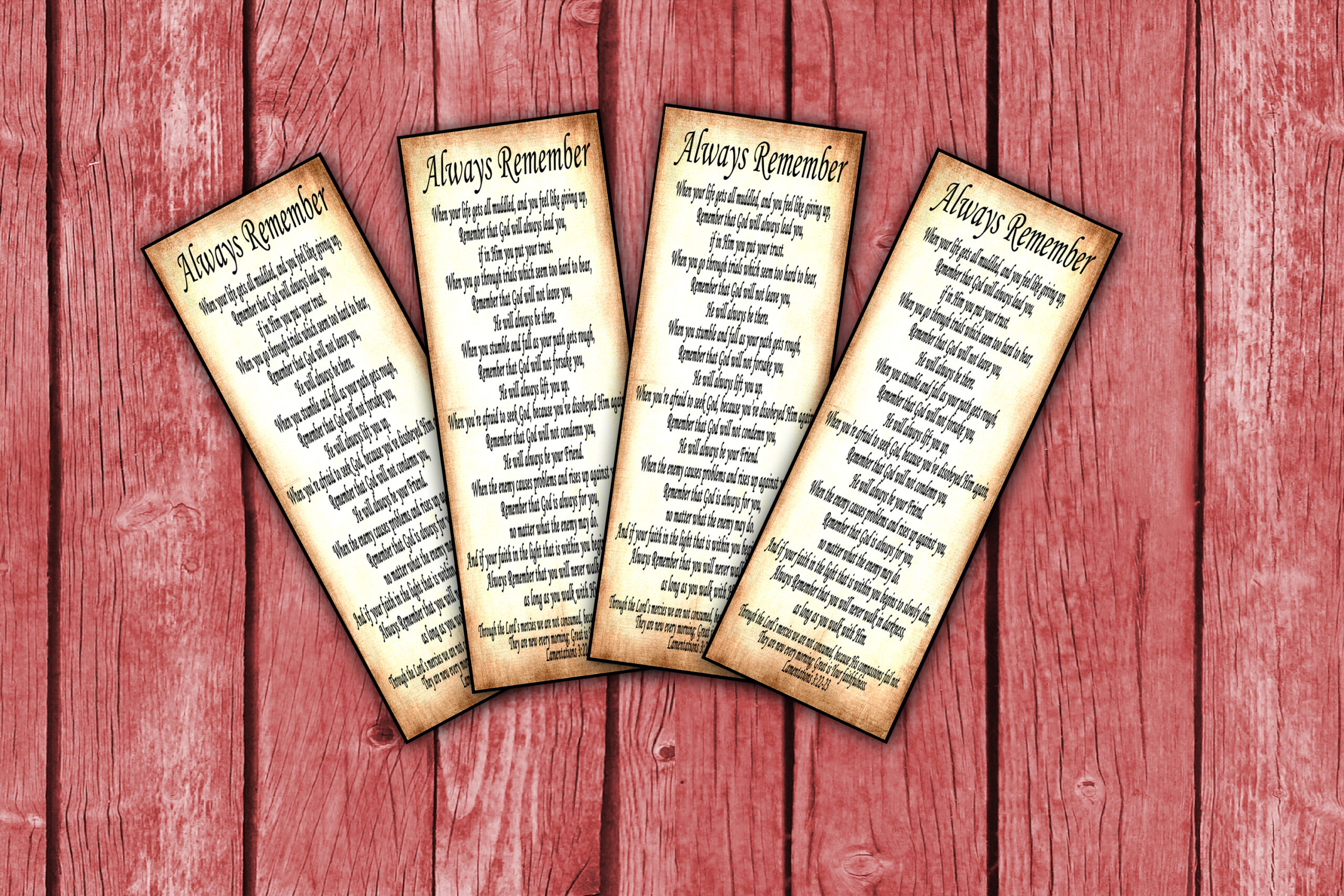 These printable bible bookmarks feature our original poem “Always Remember” which was inspired by the scripture Lamentations 3:22-23 “Through the Lord’s mercies we are not consumed, because His compassions fail not. They are new every morning; Great is Your faithfulness.” The bookmarks are sized 2×6 and come 4 to a page. You will also receive bookmarks with a print font in sizes 2×6 and 3×8 (three to a page) for easier reading. Simply print out the pdf files and cut the bookmarks (see my recommendations below). You can print as many copies as you want for yourself or to give this scripture bookmark as gifts for new members class at your church, nursing home residents, Sunday school class members, church members, prayer group, bible school, or use them as tracts to hand out to anyone you meet that needs some encouragement, and who doesn’t?