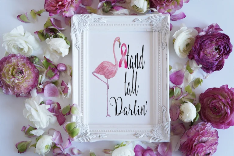 A breast cancer printable featuring a pink flamingo with the saying, Stand Tall Darlin’, with a breast cancer awareness pink ribbon substituted for the S. This is a beautiful, inspirational, and motivational art print for anyone going through breast cancer,…