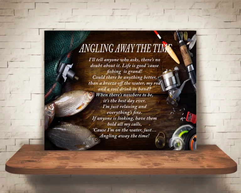 This wall art print is perfect for a Man Cave! This print features an original poem written by us, Angling Away The Time. This is the perfect gift for a Dad or husband who loves to fish. The poem reads…