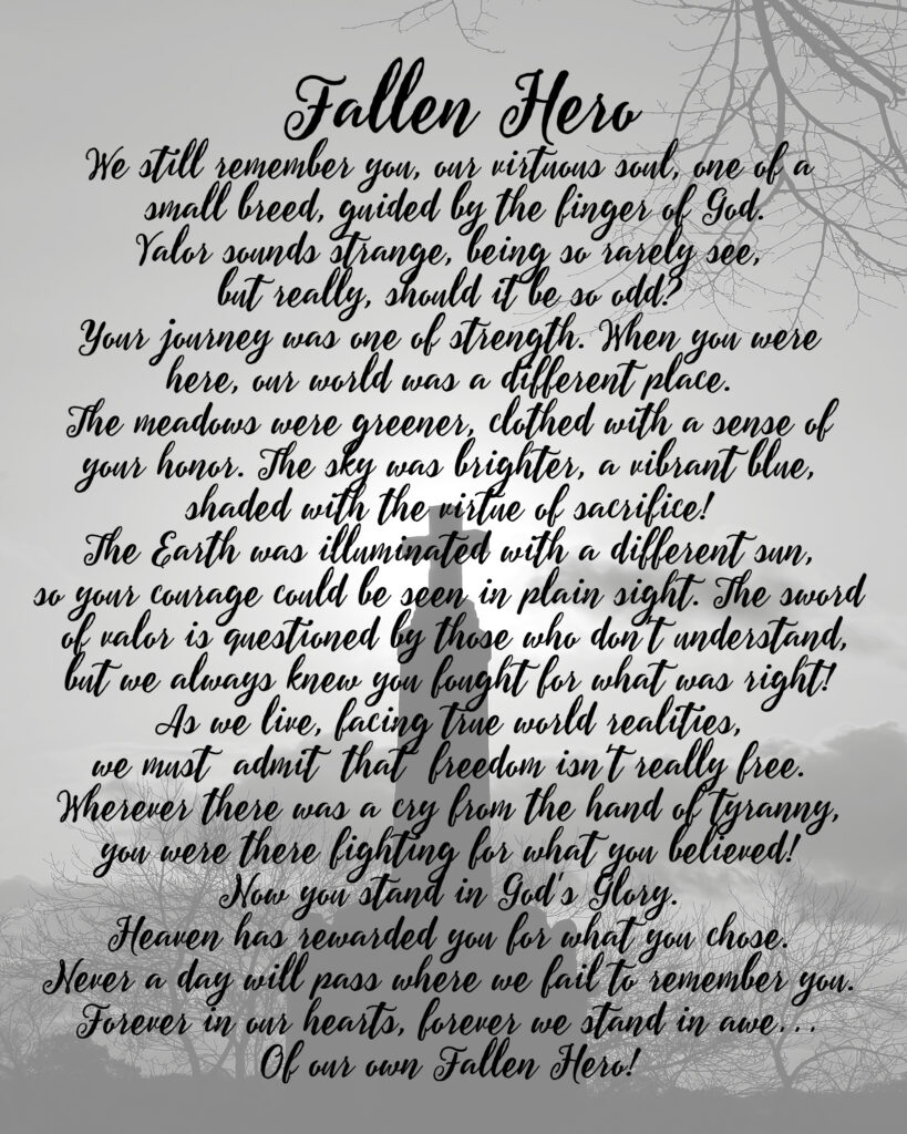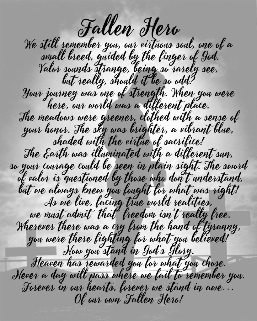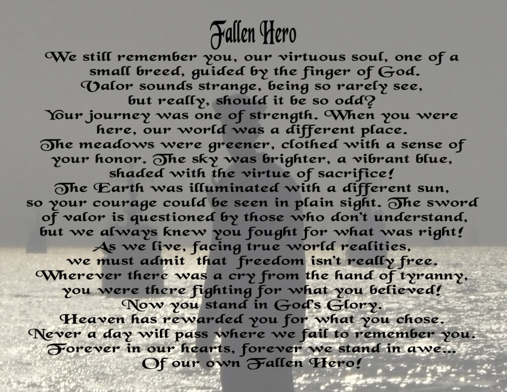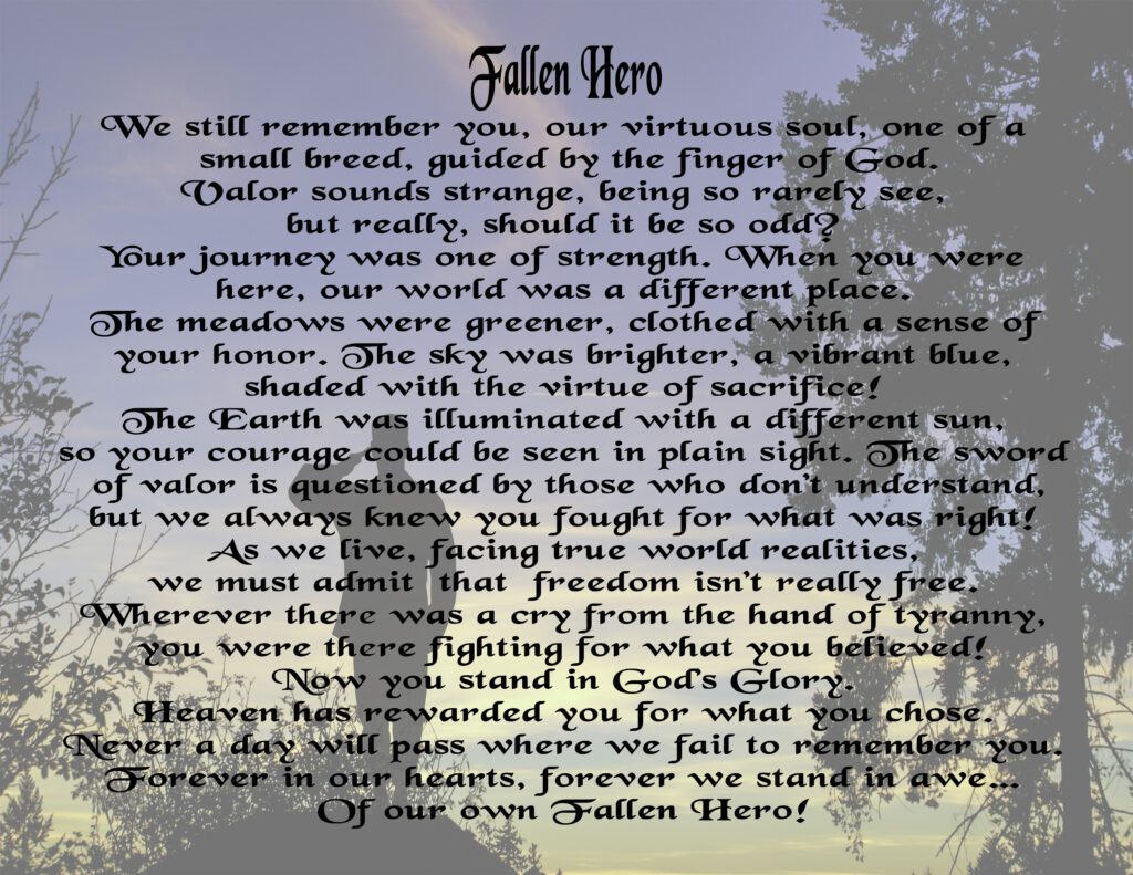 We still remember you, our virtuous soul, one of a small breed, guided by the finger of God. Valor sounds strange, being so rarely see, but really, should it be so odd? Your journey was one of strength. When you were here, our world was a different place. The meadows were greener, clothed with a sense of your honor. The sky was brighter, a vibrant blue, shaded with the virtue of sacrifice! The earth was illuminated with a different sun, so your courage could be seen in plain sight. The sword of valor is questioned by those who don’t understand, but we always knew you fought for what was right! As we live, facing true world realities, we must admit that freedom isn’t really free. Wherever there was a cry from the hand of tyranny, you were there fighting for what you believed! Now you stand in God’s Glory. Heaven has rewarded you for what you chose. Never a day will pass where we fail to remember you. Forever in our hearts, forever we stand in awe…of our own Fallen Hero!
