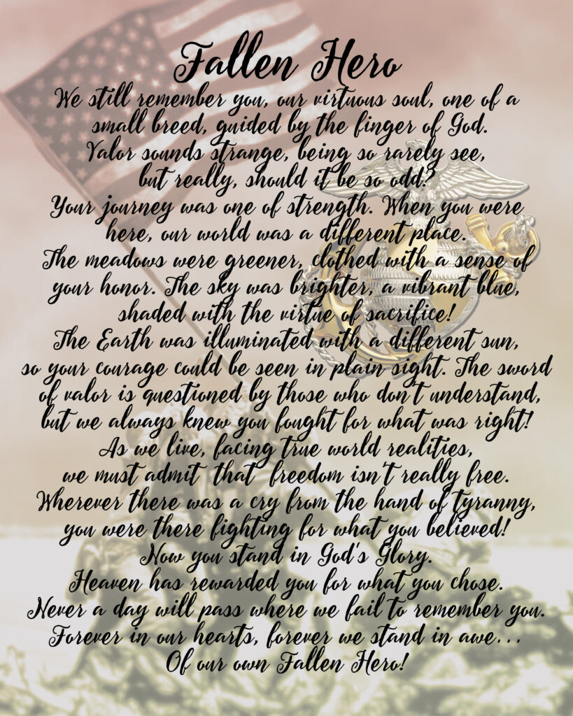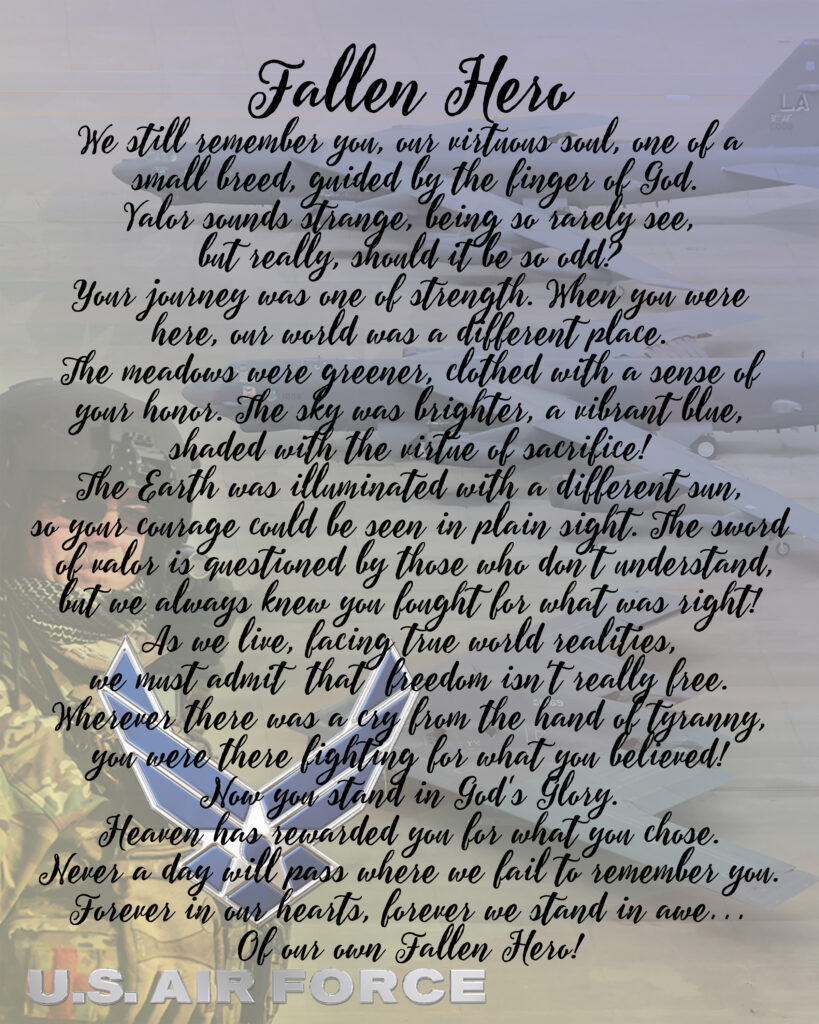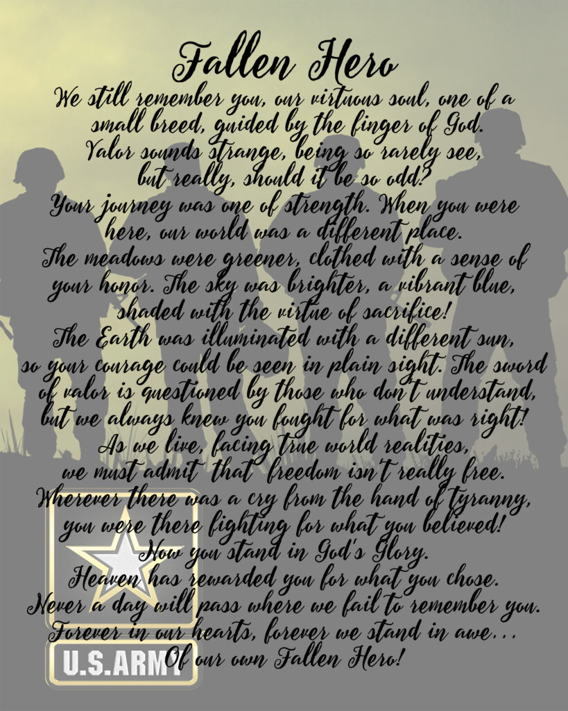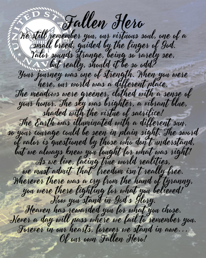 We still remember you, our virtuous soul, one of a small breed, guided by the finger of God. Valor sounds strange, being so rarely see, but really, should it be so odd? Your journey was one of strength. When you were here, our world was a different place. The meadows were greener, clothed with a sense of your honor. The sky was brighter, a vibrant blue, shaded with the virtue of sacrifice! The earth was illuminated with a different sun, so your courage could be seen in plain sight. The sword of valor is questioned by those who don’t understand, but we always knew you fought for what was right! As we live, facing true world realities, we must admit that freedom isn’t really free. Wherever there was a cry from the hand of tyranny, you were there fighting for what you believed! Now you stand in God’s Glory. Heaven has rewarded you for what you chose. Never a day will pass where we fail to remember you. Forever in our hearts, forever we stand in awe…of our own Fallen Hero!