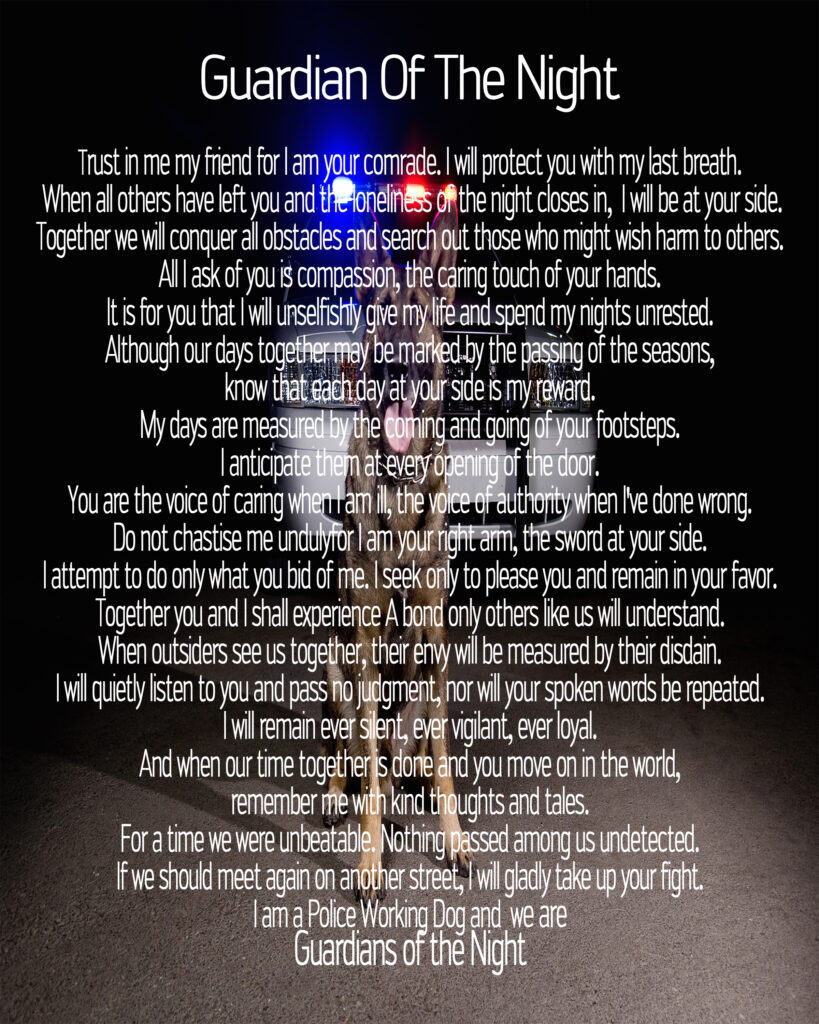 Show your appreciation for the K9 Officers who work along side of Police Offices to protect us and keep us safe with this wall art print. The poem “Guardian Of The Night” is featured on a photo background of a K9 Officer. This K9 police gift will definitely be appreciated AND treasured by all who receive it!