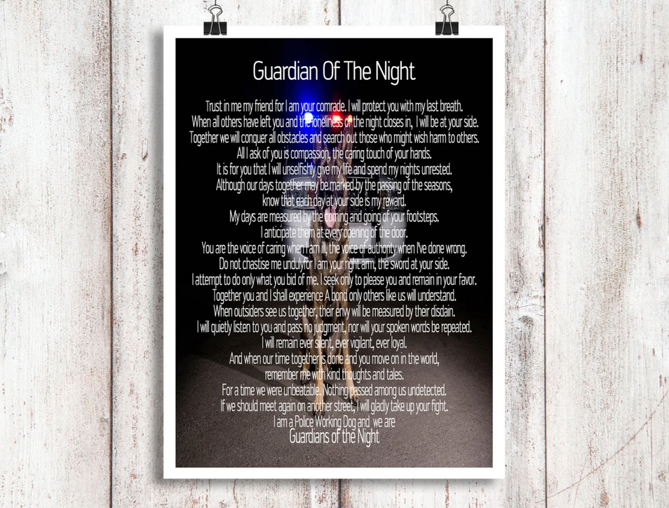 Show your appreciation for the K9 Officers who work along side of Police Offices to protect us and keep us safe with this wall art print. The poem “Guardian Of The Night” is featured on a photo background of a K9 Officer. This K9 police gift will definitely be appreciated AND treasured by all who receive it!