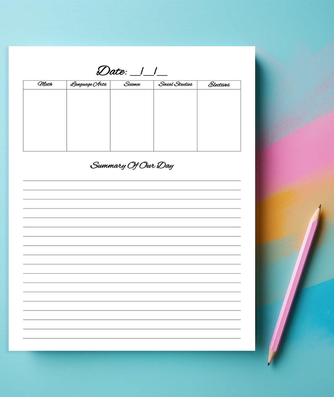 This daily journal page serves as record keeping in those states that require parents to keep a daily record of work done, and if not required in your state, this printable is an easy way to show your doubting family and friends what you do each day.