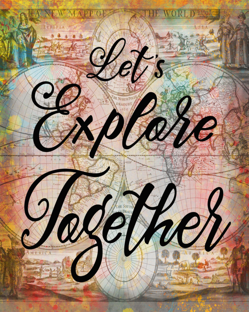 This digital vintage map quote art print- “Let’s Explore Together” – will make a great wall decor accent piece for your home, office, or classroom.
