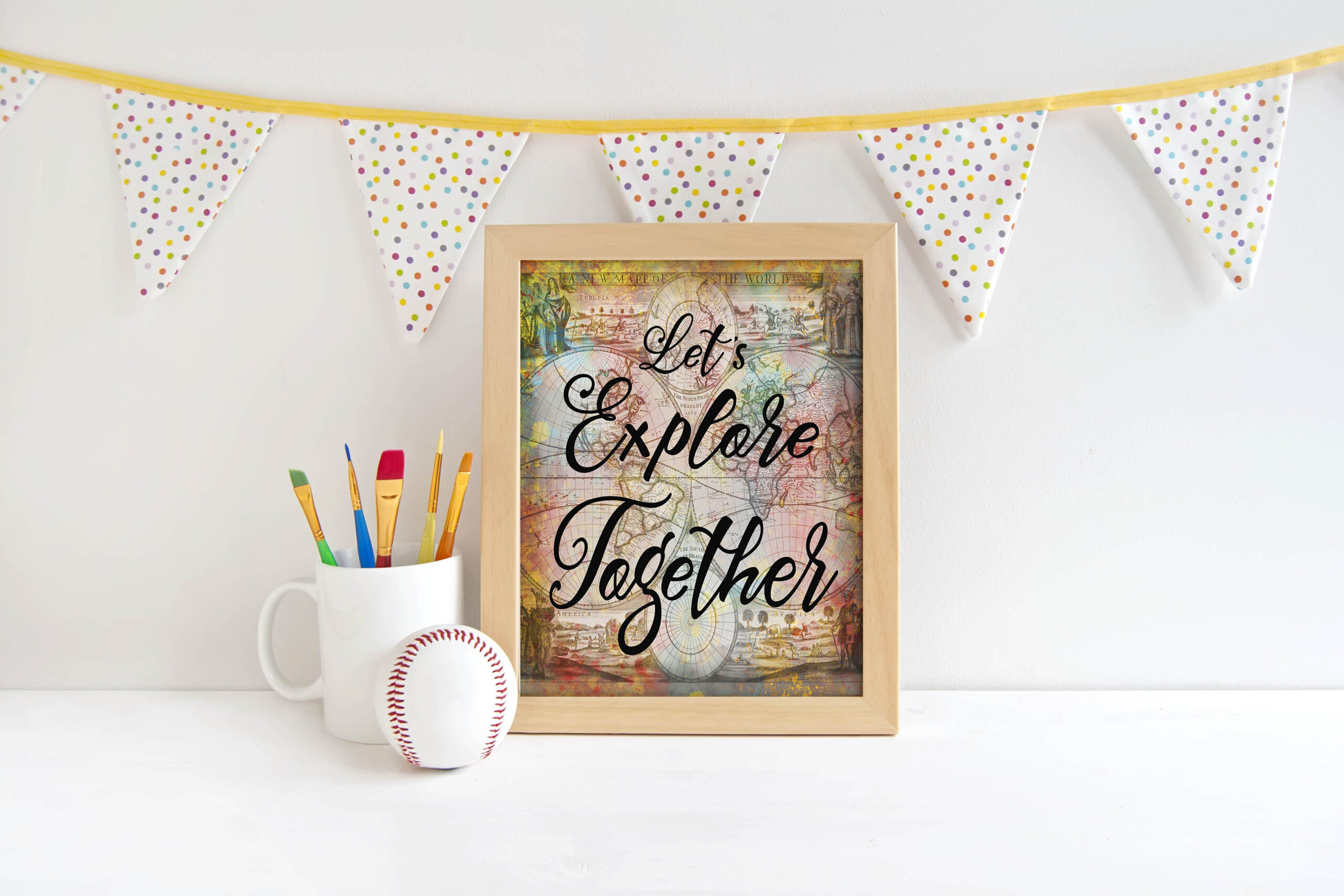 This digital vintage map quote art print- “Let’s Explore Together” – will make a great wall decor accent piece for your home, office, or classroom.