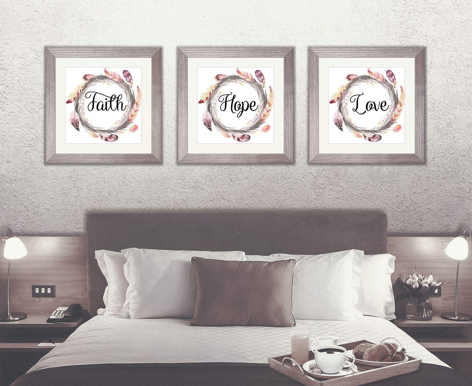 Faith Hope Love Feather Floral Wreath Square Art Print Set