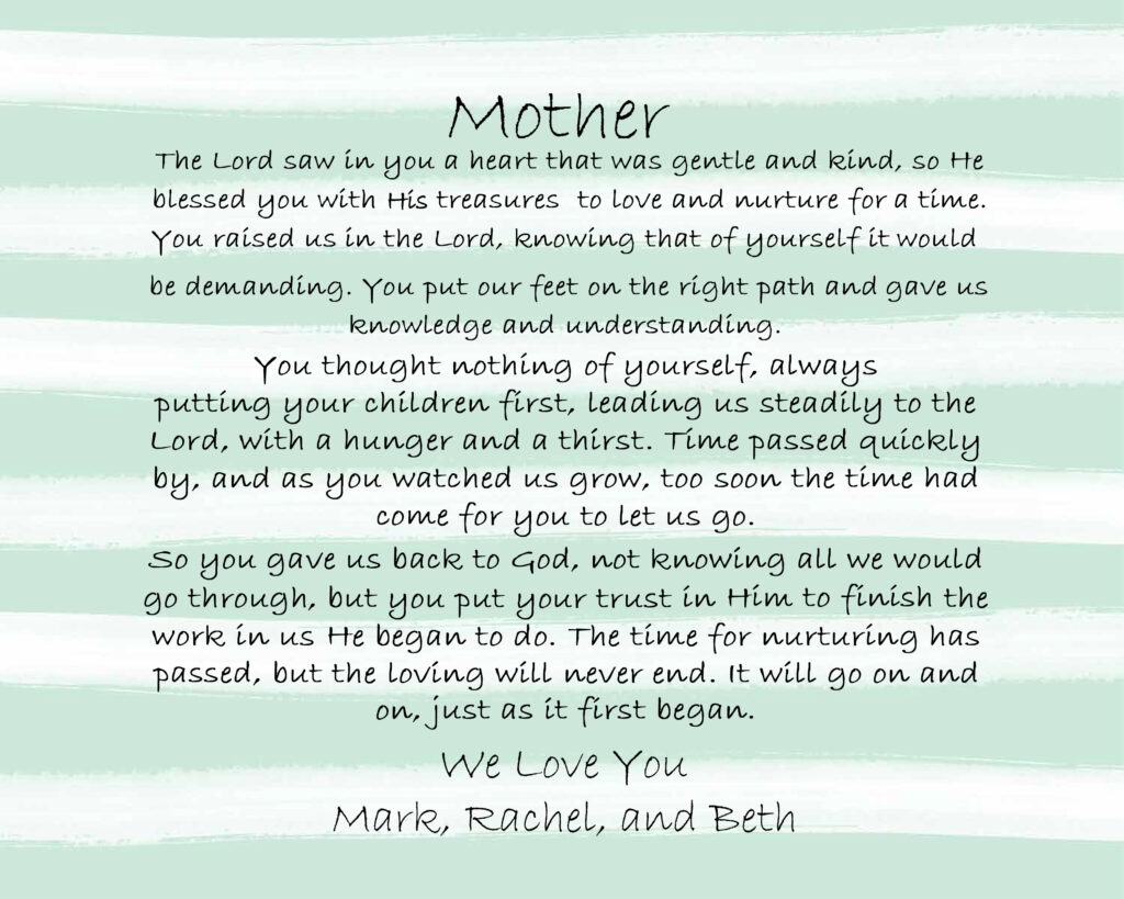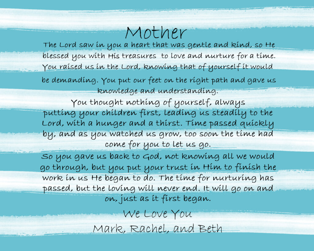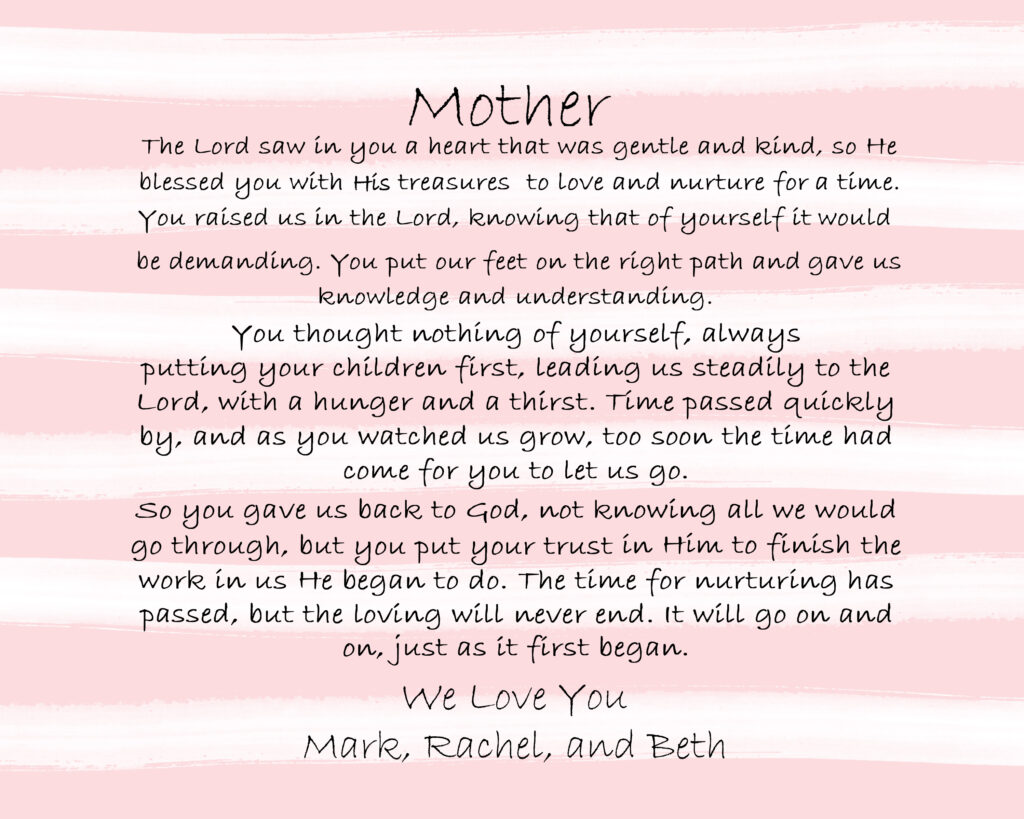 The poem “Mother” is an original poem written by my wife for her Mother on Mother’s Day many years ago. The sentiment is perfect and expresses beautifully the things we should appreciate in our Christian Mothers for the sacrifice made for their children. Your Mother will be sure to treasure this lovely gift forever!