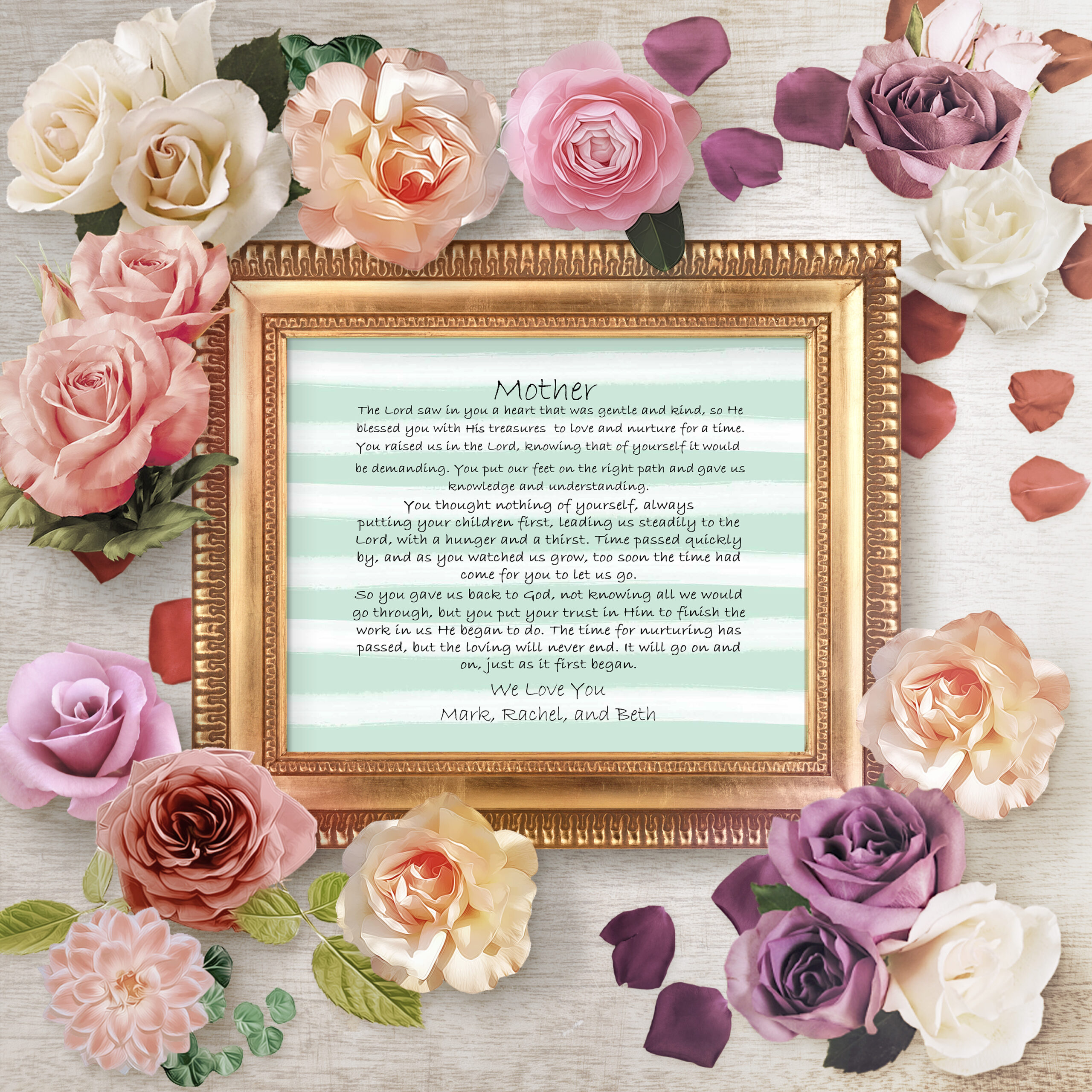 The poem “Mother” is an original poem written by my wife for her Mother on Mother’s Day many years ago. The sentiment is perfect and expresses beautifully the things we should appreciate in our Christian Mothers for the sacrifice made for their children. Your Mother will be sure to treasure this lovely gift forever!
