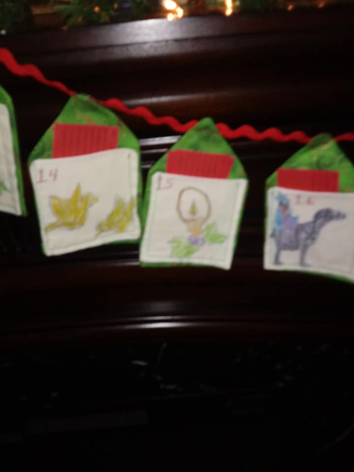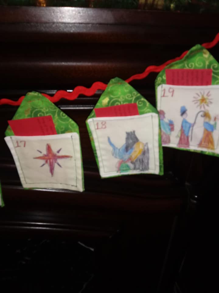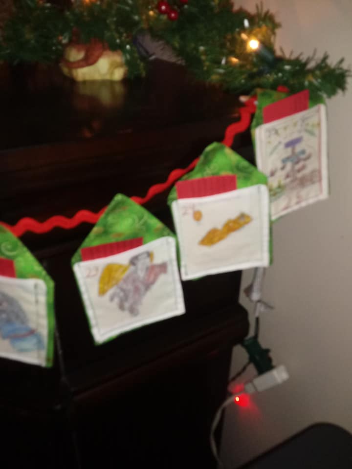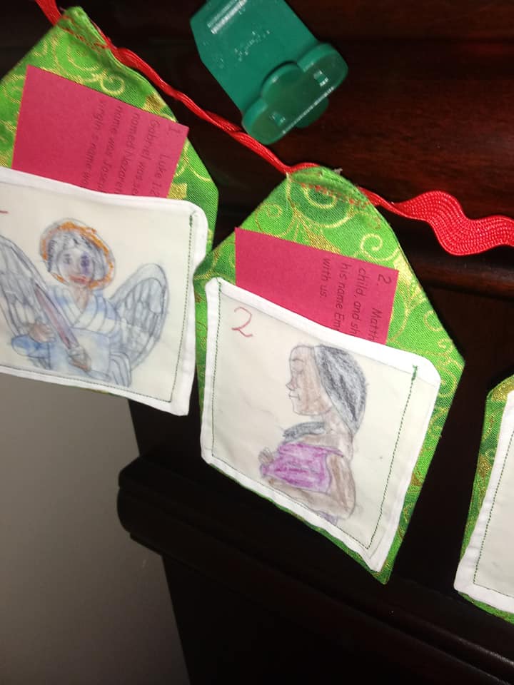 One of my favorite decorations and traditions since 2008 has been our Christmas Advent Activities Garland. That year, I found some Advent coloring pages online. I had my artist child draw the pictures in a smaller size, and let the other kids color them. I transferred the finished colored drawings onto fabric that I made in the shape of little houses, which I attached to a ribbon to create a beautiful Advent garland. There are so many ways to do an Advent or Christmas countdown. You can buy a garland already made, or there are plenty of ideas to make your own. A Google search for “advent garland” will yield a plethora of options.