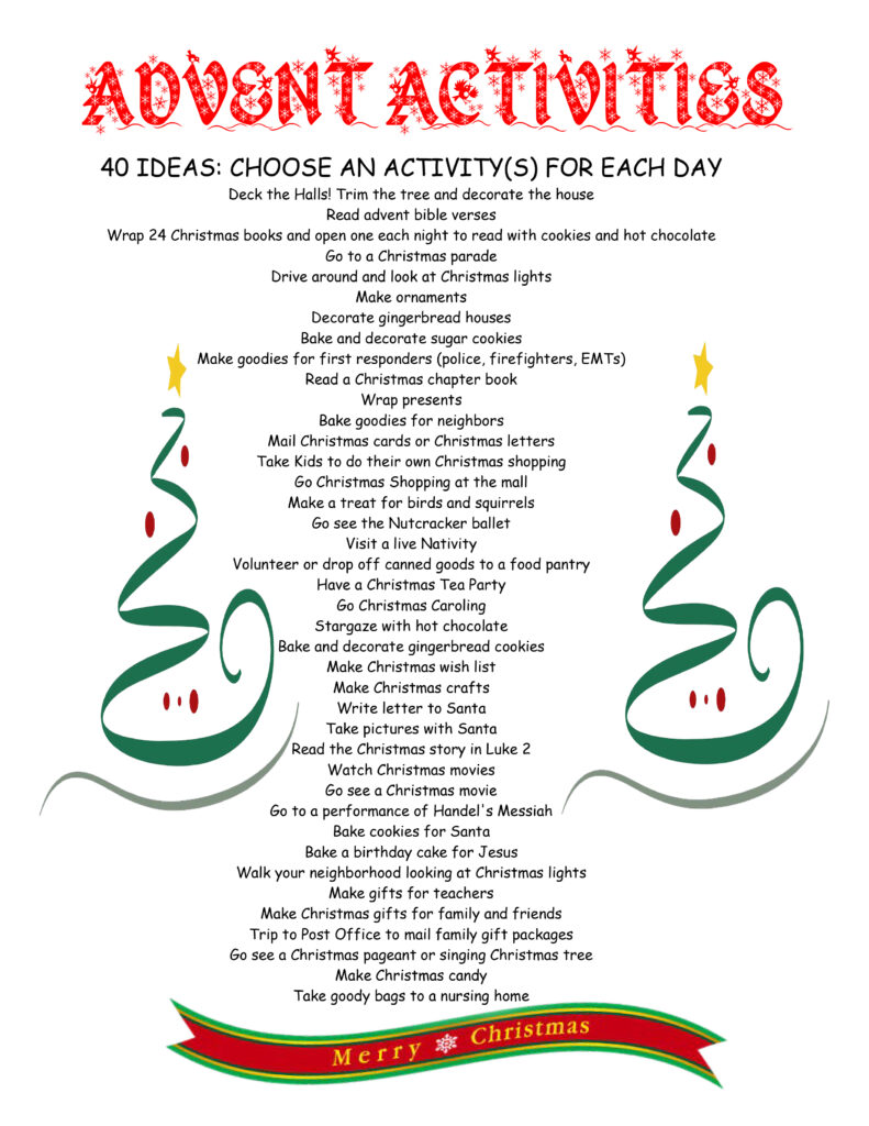 The hard part is trying to decide what activities you want to do and what day you’re going to do them. The holidays are usually a busy and stressful time, so you will want to plan your Christmas activities in a way that doesn’t add to that, but allows you to slow down and enjoy the Christmas season and make it meaningful for your family.