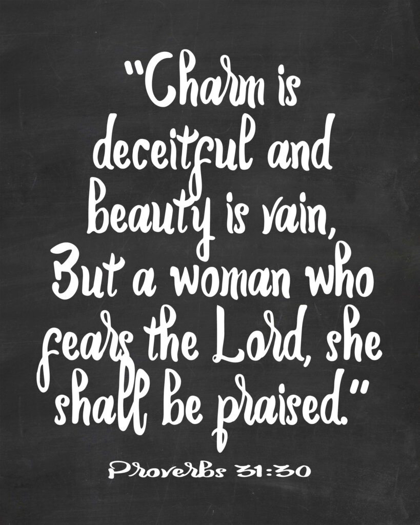 This scripture printable wall art is from Proverbs 31 where the virtuous woman is described. This bible verse is Proverbs 31:30, “Charm is deceitful and beauty is vain, But a woman who fears the Lord, she shall be praised.” This chalkboard art print is for any woman who aspires to be like the Proverbs 31 woman.