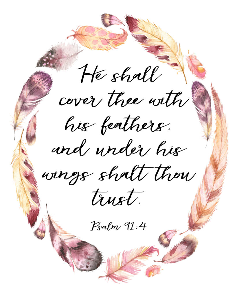 This is a beautiful feather scripture wall art print. The KJV bible verse is Psalm 91:4 “He shall cover thee with his feathers, and under his wings shalt thou trust.” This printable scripture can be hanging on your wall in minutes!