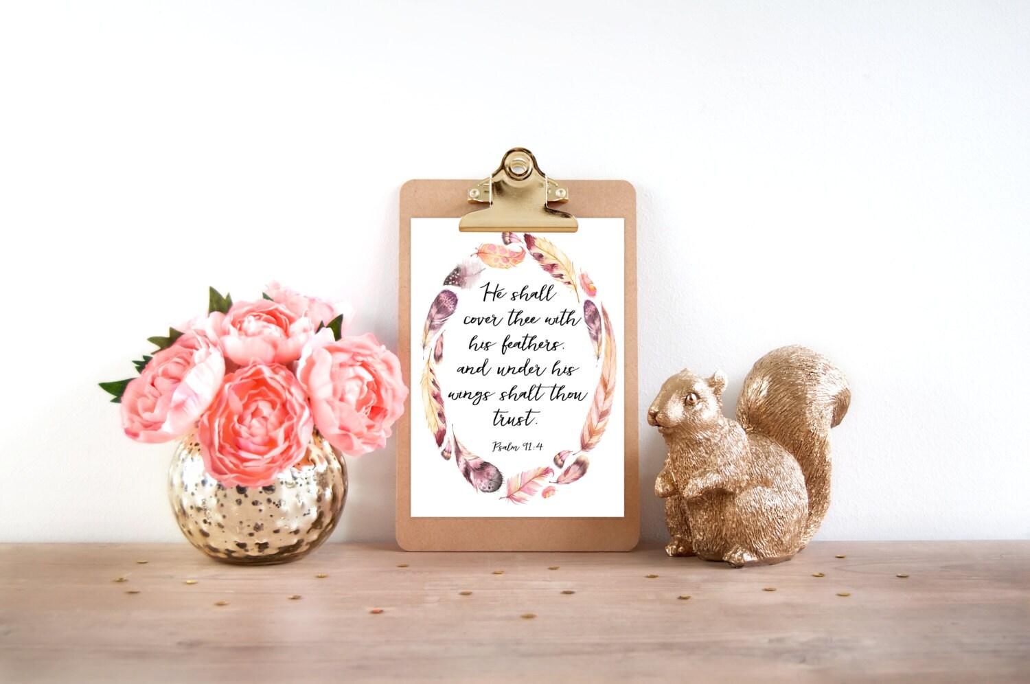 This is a beautiful feather scripture wall art print. The KJV bible verse is Psalm 91:4 “He shall cover thee with his feathers, and under his wings shalt thou trust.” This printable scripture can be hanging on your wall in minutes!