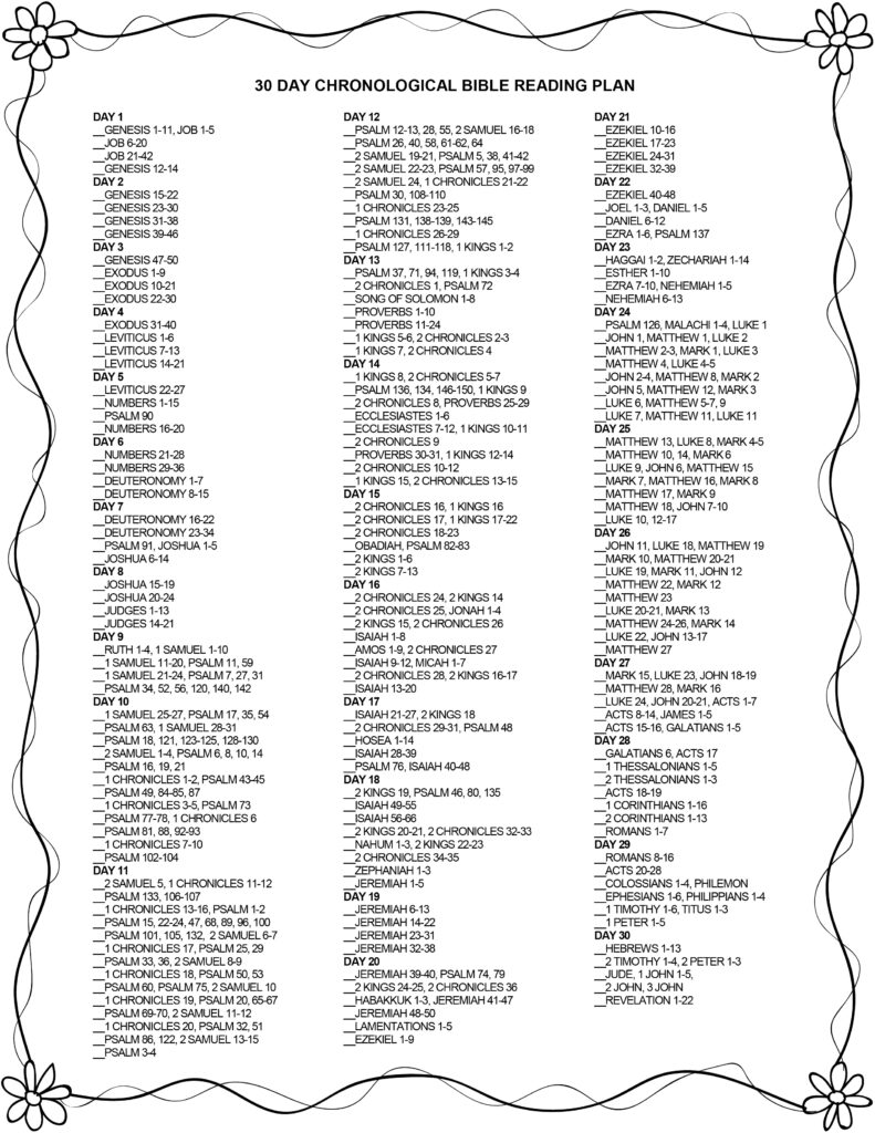 If you’d like to renew your mind and refresh your spirit, you can download the FREE 30 Day Bible Reading Plan Checklist. I prefer to read chronologically, but you may prefer book order, so download your preference. I would like to suggest you read chronologically because it will just flow together better.